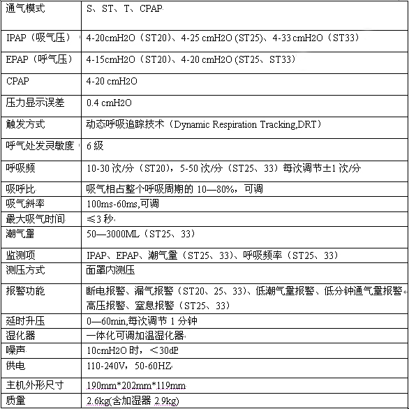 凱迪泰雙水平ST20/25呼吸機(jī)主要參數(shù)